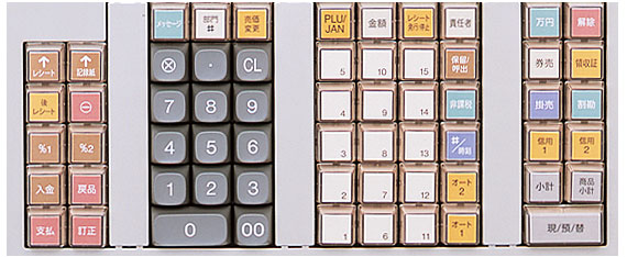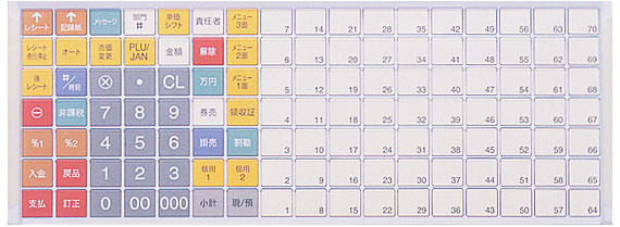 | 3面のメニュー切り替えに対応したワンタッチPLUキー70個を標準で持つ、フラットキーボードを採用。時間帯でメニューを切り替える飲食店などに最適です。 |