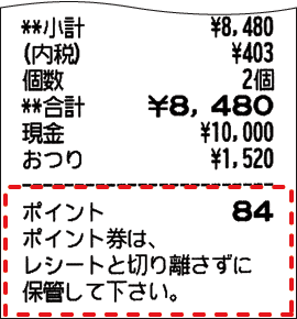 レシートの下に、お買い上げ金額に応じたポイント数を印字できます。次回のお買い物に使っていただくなど、お客様へのサービスを通じて、リピート客の拡大にご活用いただけます。